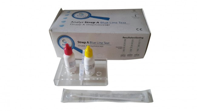 Analyz Strep A Blue Line Testär en produktlinje för att detektera streptokock A i svalget, för professionellt bruk. Analysen tar bara några minuter och är enkla tester att utföra för den analyserande personalen. Stickor med: 50 tester/förpackning, 50 provrör, 50 provpinnar, 2 reagenser, 1 positiv och 1 negativ kontroll.