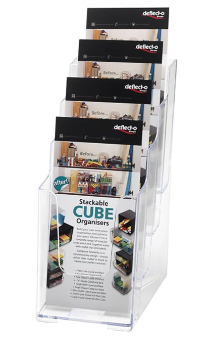 Broschyrställ av transparent plast. Kan monteras på vägg eller ställas på t.ex bord och receptionsdisk, för exponering av information och reklam.Passar papper med bredd 110mm och höjd 220mm.Mått: 108 x 254 x 254 mm.
