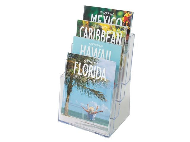 Broschyrställ av transparent plast. Kan monteras på vägg eller ställas på t.ex bord och receptionsdisk, för exponering av information och reklam. Mått: 165 x 254 x 159 mm.
