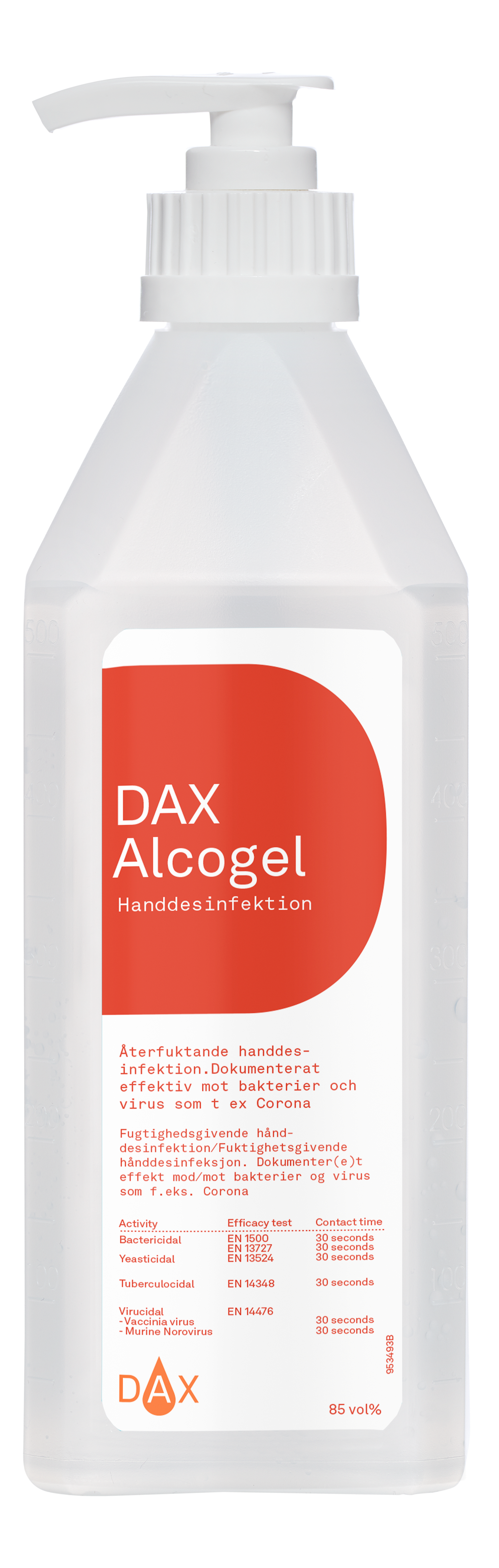 DAX Alcogel är avsedd för desinfektion av händer och och är effektiv mot bakterier och många typer av virus som t.ex. förkylningsvirus och influensavirus. Produkten är etanolbaserad och har en alkoholhalt på 85 vol%. Innehåller glycerin som återfuktar huden.
