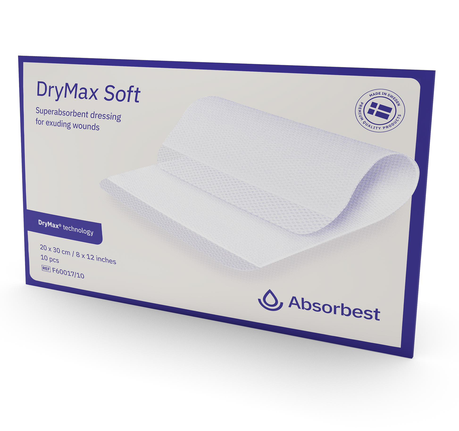 DryMax Extra Soft är ett sterilt, följsamt och superabsorberande förband för vätskande sår. DryMax Extra Soft absorberar och behåller vätskan inuti förbandet. Sårexsudat absorberas vertikalt i förbandet och förvandlas till en gel, vilket minskar risken för maceration samtidigt som en fuktig sårläkningsmiljö bibehålls. Den sömlösa designen förenklar positionering av förbandet på såret. Förbandet har en enkel design med absorption från båda sidor vilket omöjliggör felanvändning. Denna egenskap gör även förbandet staplingsbart, så att flera förband kan placeras ovanpå varandra om extra hög absorptionskapacitet skulle krävas. Förbandet känns torrt och behagligt för patienteten samtidigt som det bidrar till en fuktig sårläkningsmiljö. Den hydrofila kontaktytan transporterar effektivt vätskan bort från såret och fördelar den jämnt in i förbandets kärna, absorbest core. Förbandets supertunna och mjuka egenskaper gör att det passar på alla platser på kroppen. DryMax Extra Soft är utvecklad för att fungera väl tillsammans med kompressionsbehandling.