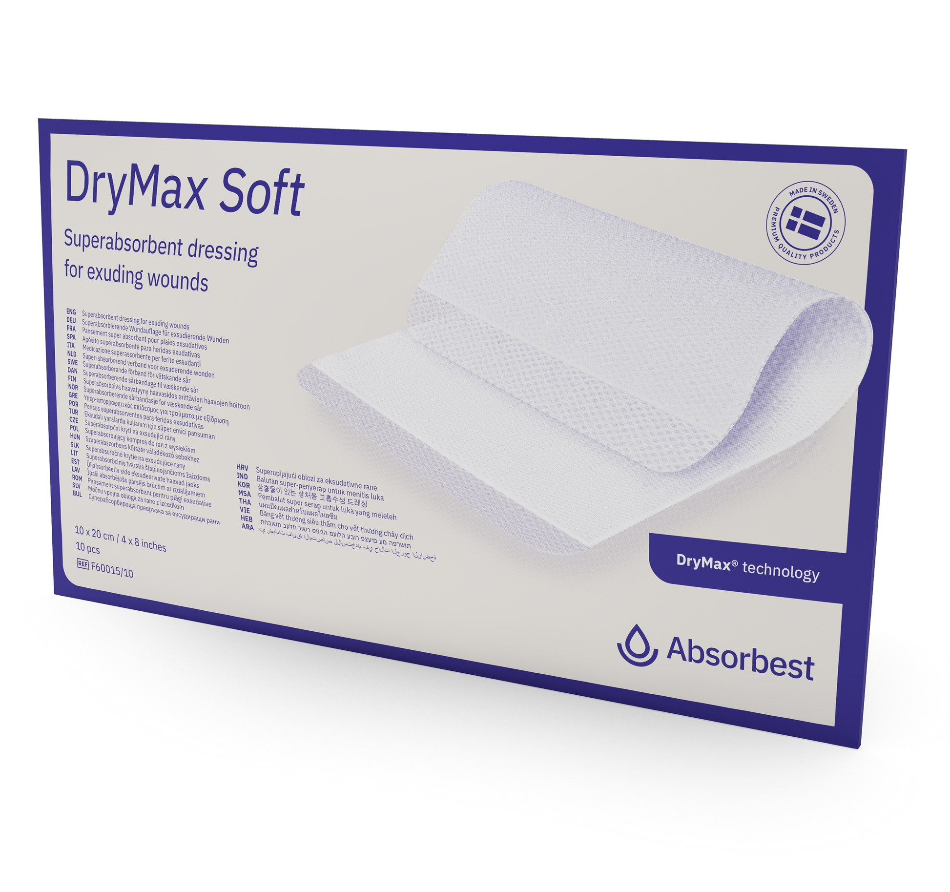DryMax Extra Soft är ett sterilt, följsamt och superabsorberande förband för vätskande sår. DryMax Extra Soft absorberar och behåller vätskan inuti förbandet. Sårexsudat absorberas vertikalt i förbandet och förvandlas till en gel, vilket minskar risken för maceration samtidigt som en fuktig sårläkningsmiljö bibehålls. Den sömlösa designen förenklar positionering av förbandet på såret. Förbandet har en enkel design med absorption från båda sidor vilket omöjliggör felanvändning. Denna egenskap gör även förbandet staplingsbart, så att flera förband kan placeras ovanpå varandra om extra hög absorptionskapacitet skulle krävas. Förbandet känns torrt och behagligt för patienteten samtidigt som det bidrar till en fuktig sårläkningsmiljö. Den hydrofila kontaktytan transporterar effektivt vätskan bort från såret och fördelar den jämnt in i förbandets kärna, absorbest core. Förbandets supertunna och mjuka egenskaper gör att det passar på alla platser på kroppen. DryMax Extra Soft är utvecklad för att fungera väl tillsammans med kompressionsbehandling.