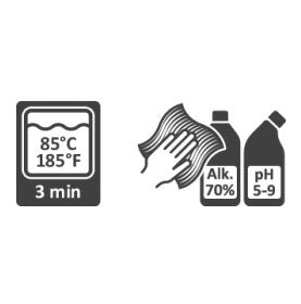 Rengör produkten med rengöringsmedel utan lösningsmedel och med pH-värde 5-9 eller med 70% desinfektionssprit. Kan vid behov dekontamineras i max 85°C.