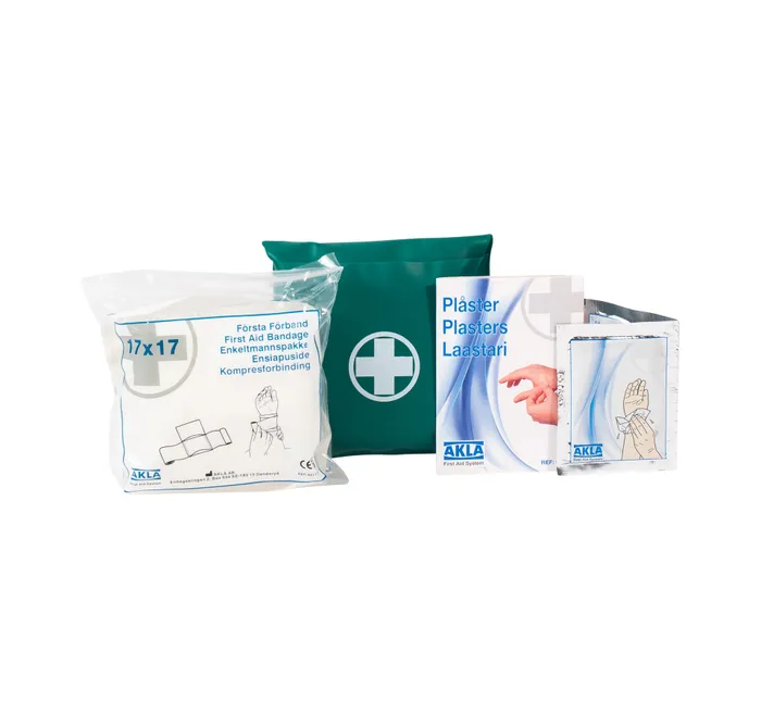 Första förband - ett måste för dig som arbetar i tex skogen! En olycka händer snabbt och stora blödningar eller sårskador måste stoppas fortast möjligt. Ha därför alltid första förband tillgängligt när du exempelvis arbetar i skogen, på gården eller i verkstan. Denna fickförpackning är tillverkad av mjuk grön plast som tål att hänga med på olika äventyr, oavsett väder.