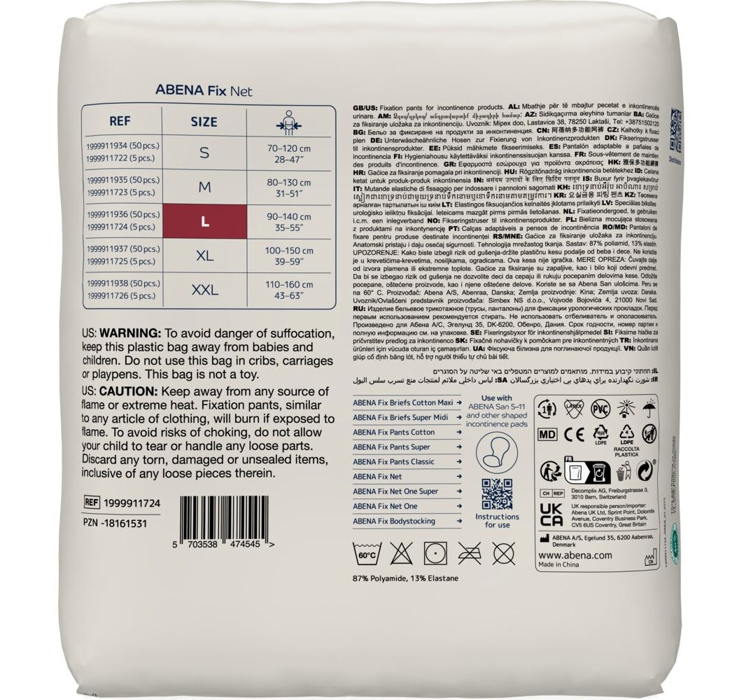 ABENA Fix Net är en unisexfixeringsbyxa med mindre maskor för flergångsbruk. Nätsticktekniken som används bygger på varpstickning, där garnet stickas i sicksack längs med hela tygets längdriktning. ABENA Fix Net har horisontella stabiliserande zoner, som är idealiska för att hålla större skydd på plats. Trots den lätta konstruktionen är nätprodukterna hållbara. ABENA Fix Net har enkel produktigenkänning tack vare färgkoden på förpackningen och på insidan av linningen. I förpackningen finns det också information om produktnamn, storlek, tvättråd och materialsammansättning. Tillverkad i 87 % polyester och 13 % elastan.