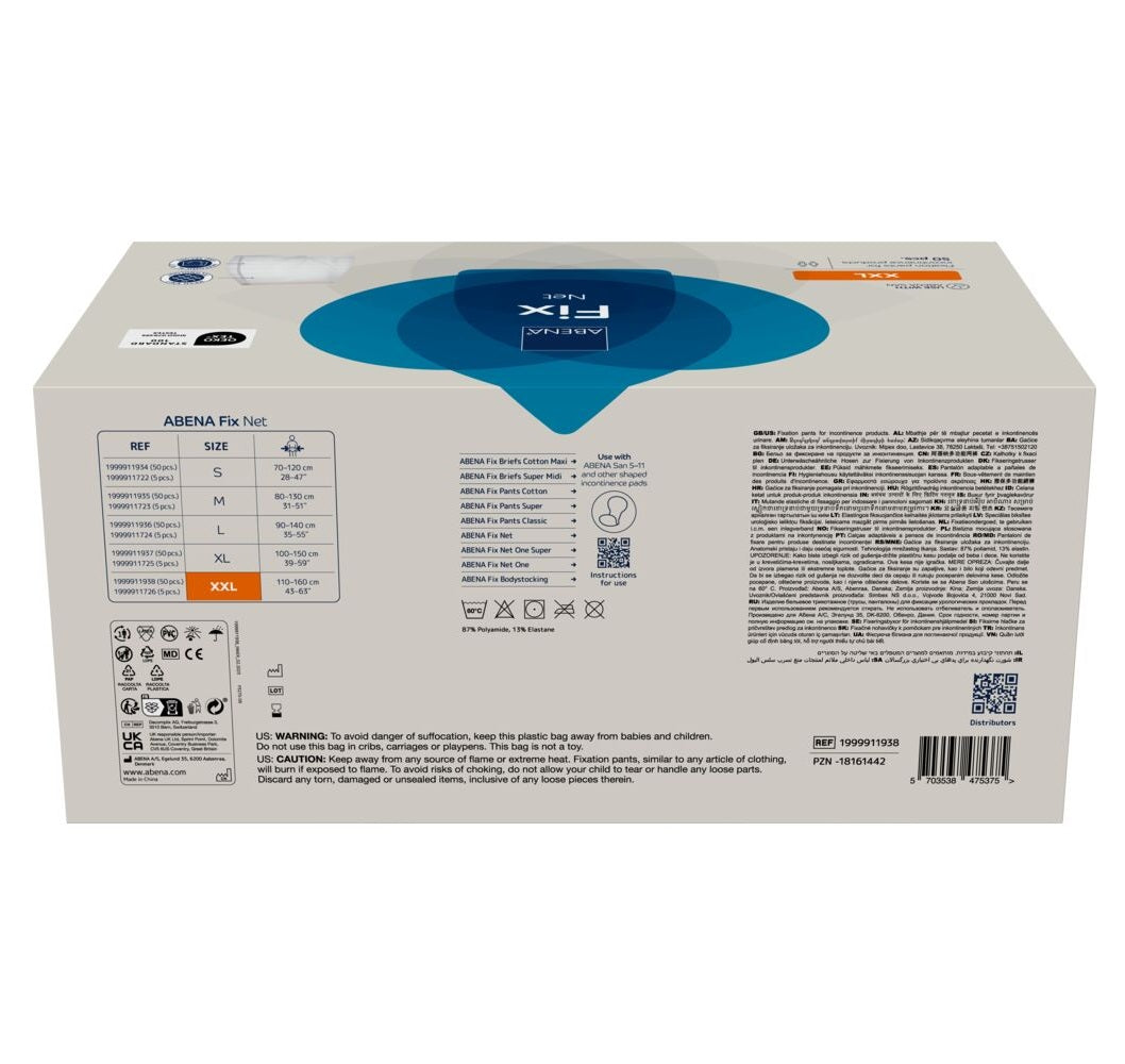 ABENA Fix Net är en unisexfixeringsbyxa med mindre maskor för flergångsbruk. Nätsticktekniken som används bygger på varpstickning, en metod där garnet stickas i sicksack längs med hela tygets längdriktning. ABENA Fix Net har horisontella stabiliserande zoner, som är idealiska för att hålla större skydd på plats. Trots den lätta konstruktionen är nätprodukterna hållbara. ABENA Fix Net har enkel produktigenkänning tack vare färgkoden på förpackningen och på insidan av linningen. Och i förpackningen finns det också information om produktnamn, storlek, tvättråd och materialsammansättning. Tillverkad i 87 % polyester och 13 % elastan.