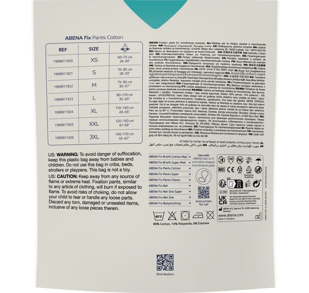 ABENA Fix Pants Cotton är en elastisk andningsbar fixeringsbyxa med ben, tillverkad i främst bomullsmaterial. Bomull är ett andningsbart och mjukt material som transporterar bort fukt från huden, så att användaren hela tiden känner sig torr och bekväm. Byxorna ser ut som vanliga underkläder. Det elastiska materialet och sticktekniken håller skyddet tätt mot kroppen och garanterar då läckagesäkerhet. Det gör att de fungerar optimalt oavsett aktivitetsnivå och rörelseförmåga. Den sömlösa sticktekniken – ett innovativt sätt att tillverka textilier som är nästan helt sömlösa – förhindrar tryckmärken och hudirritation. Produkterna kan tvättas upp till 100 gånger, vilket ger betydande kostnadseffektivitet med längre användningstid. ABENA Fix Pants Cotton har enkel produktigenkänning tack vare färgkoden både på förpackningen och på insidan av midjebanden, som ger information om produktnamn, storlek, tvättråd och materialsammansättning. Tillverkad i 80 % bomull, 14 % polyamid och 6 % elastan.