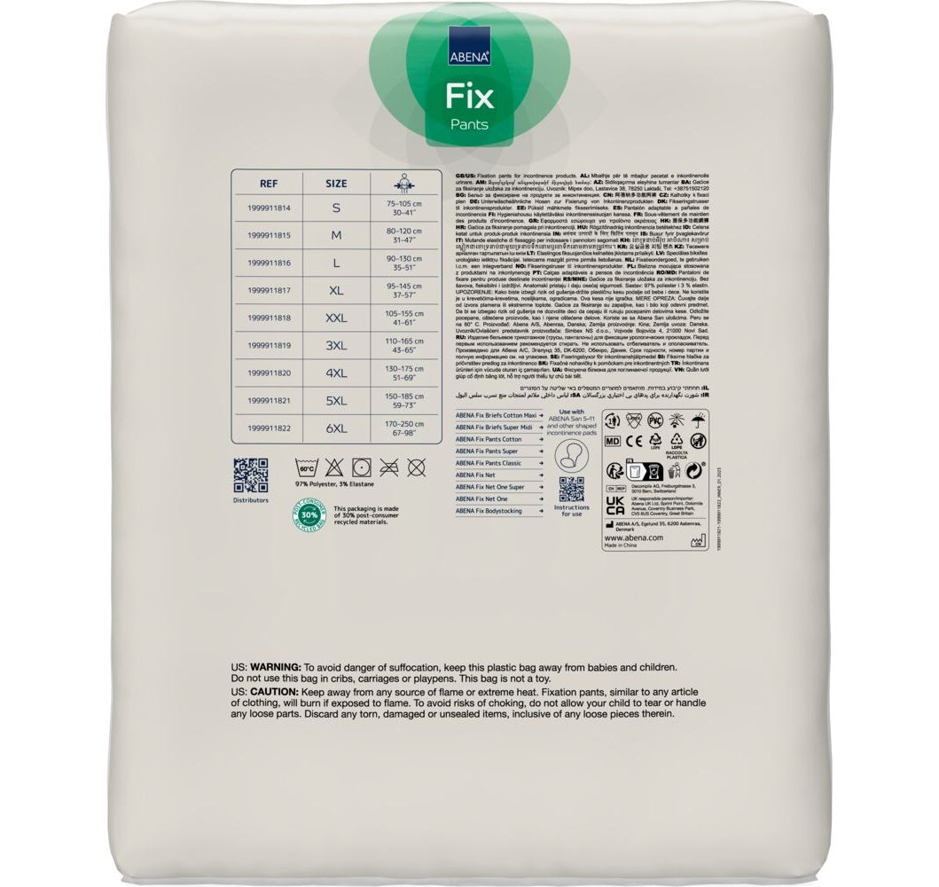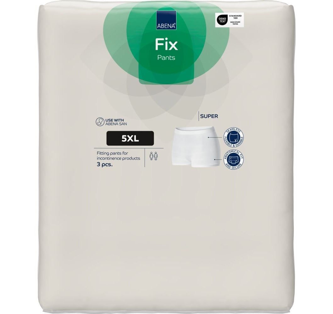 ABENA Fix Pants Super är stretchiga fixeringsbyxor med ben, tillverkade i andningsbart, mjukt material och designade för att passa kroppens anatomiska form. Byxorna ser ut och känns som vanliga underkläder. Det elastiska materialet och sticktekniken håller skydden tätt mot kroppen och hjälper till att undvika läckage. Det gör att de fungerar optimalt oavsett aktivitetsnivå och rörelseförmåga. Den sömlösa sticktekniken – ett innovativt sätt att tillverka textilier som är nästan helt sömlösa – förhindrar tryckmärken och hudirritation. Produkten kan tvättas upp till 100 gånger, vilket ger hög kostnadseffektivitet med längre användningstid. ABENA Fix Pants Super har enkel produktigenkänning tack vare färgkoden både på förpackningen och på insidan av midjebanden, som ger information om produktnamn, storlek, tvättråd och materialsammansättning. Tillverkad i 97 % polyester och 3 % elastan.