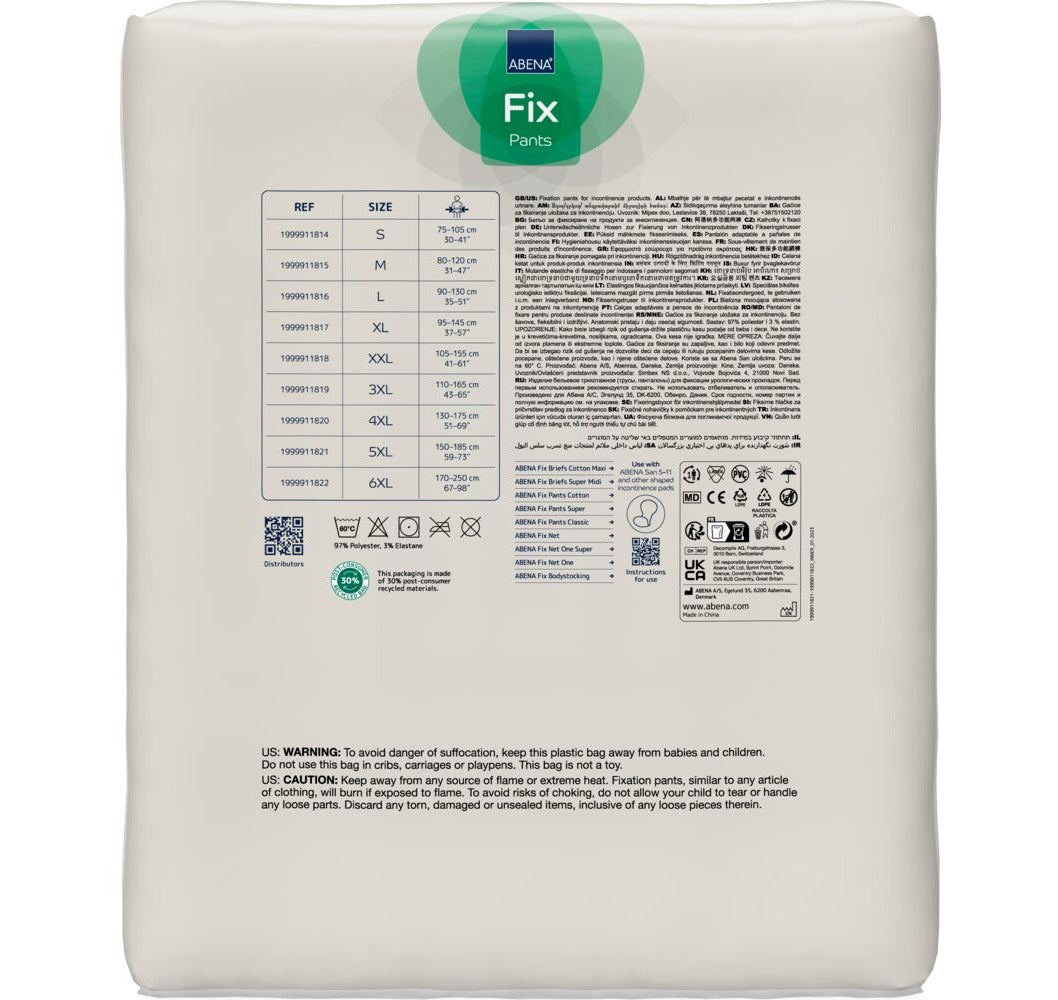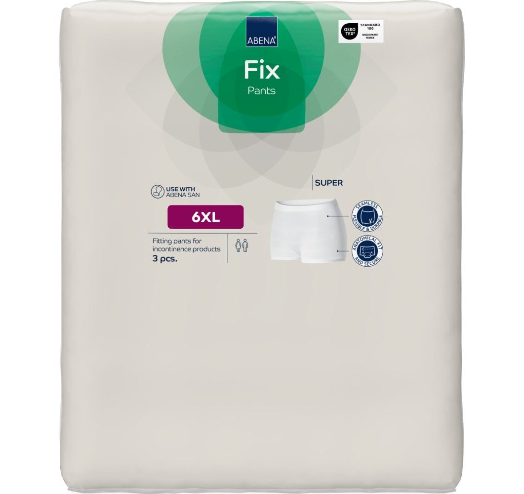 ABENA Fix Pants Super är stretchiga fixeringsbyxor med ben, tillverkade i andningsbart, mjukt material och designade för att passa kroppens anatomiska form. Byxorna ser ut och känns som vanliga underkläder. Det elastiska materialet och sticktekniken håller skydden tätt mot kroppen och hjälper till att undvika läckage. Det gör att de fungerar optimalt oavsett aktivitetsnivå och rörelseförmåga. Den sömlösa sticktekniken – ett innovativt sätt att tillverka textilier som är nästan helt sömlösa – förhindrar tryckmärken och hudirritation. Produkten kan tvättas upp till 100 gånger, vilket ger hög kostnadseffektivitet med längre användningstid. ABENA Fix Pants Super har enkel produktigenkänning tack vare färgkoden både på förpackningen och på insidan av midjebanden, som ger information om produktnamn, storlek, tvättråd och materialsammansättning. Tillverkad i 97 % polyester och 3 % elastan.