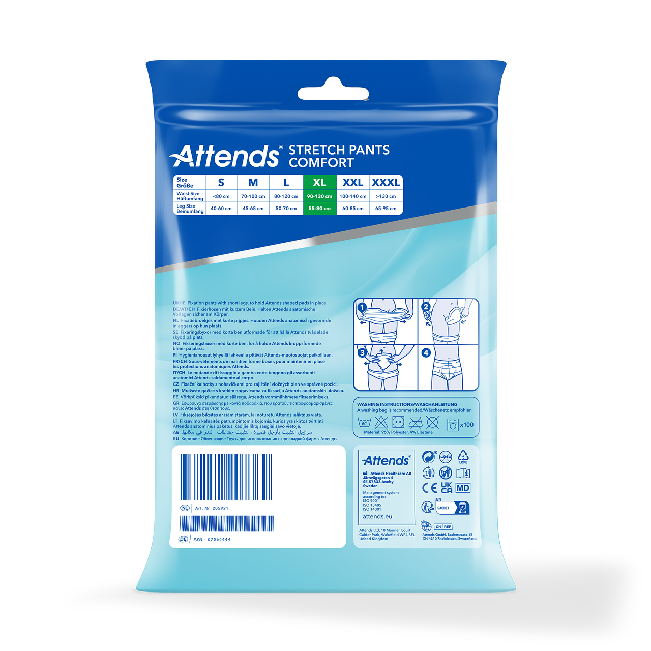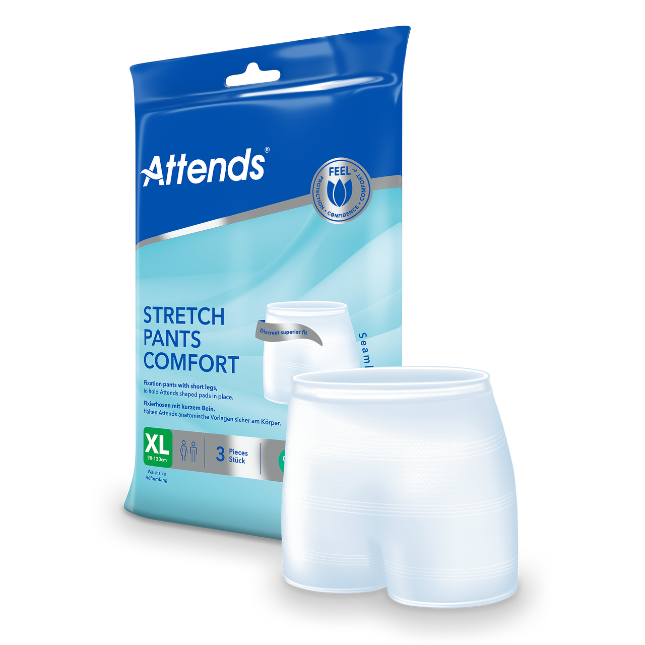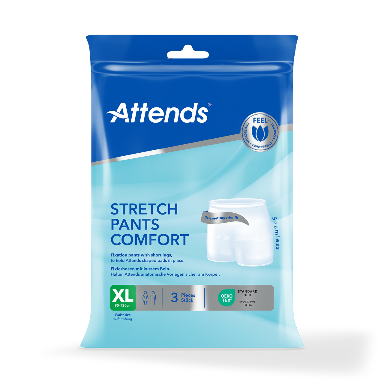 Attends Stretch Pants Comfort XL är tvättbara och återanvändbara fixeringsbyxor med korta ben. Fixeringsbyxorna används tillsammans med tvådelade inkontinensskydd och säkerställer en tät fixering vilket minimerar risken för läckage, samtidigt som de är diskreta med en bekväm passform. Attends Stretch Pants Comfort är gjorda av ett elastiskt material som ger bra komfort, passform och stöd. Den sömlösa designen minskar risken för märken på huden och ger en säker och diskret fixering. Mät höfter och midja och utgå från det största måttet för att välja rätt storlek på fixeringsbyxan.