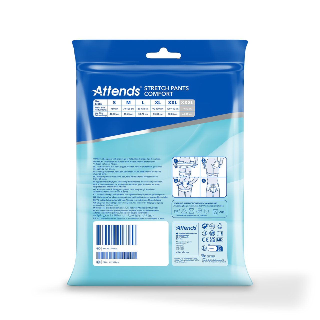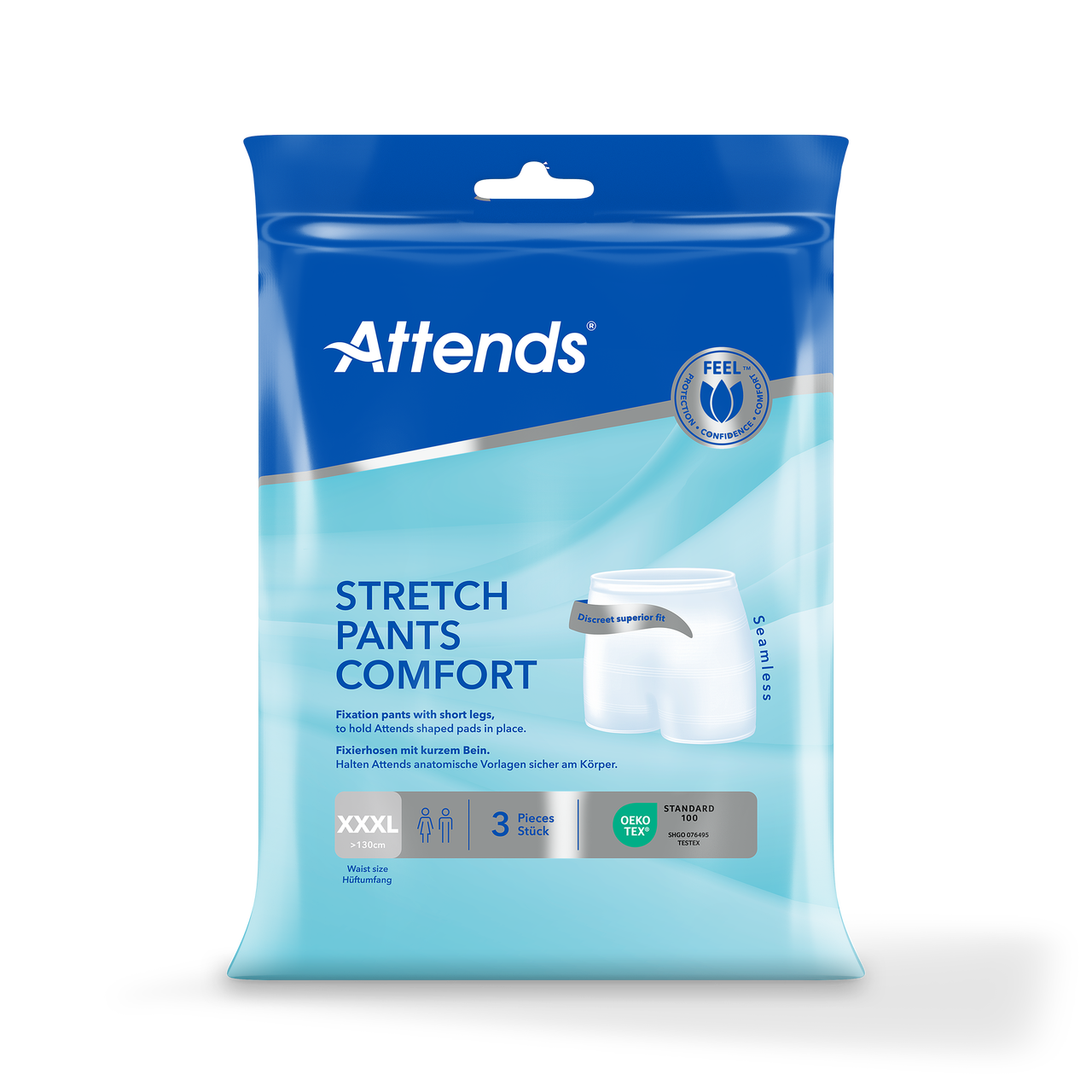 Attends Stretch Pants Comfort XXXL är tvättbara och återanvändbara fixeringsbyxor med korta ben. Fixeringsbyxorna används tillsammans med tvådelade inkontinensskydd och säkerställer en tät fixering vilket minimerar risken för läckage, samtidigt som de är diskreta med en bekväm passform. Attends Stretch Pants Comfort är gjorda av ett elastiskt material som ger bra komfort, passform och stöd. Den sömlösa designen minskar risken för märken på huden och ger en säker och diskret fixering. Mät höfter och midja och utgå från det största måttet för att välja rätt storlek på fixeringsbyxan.
