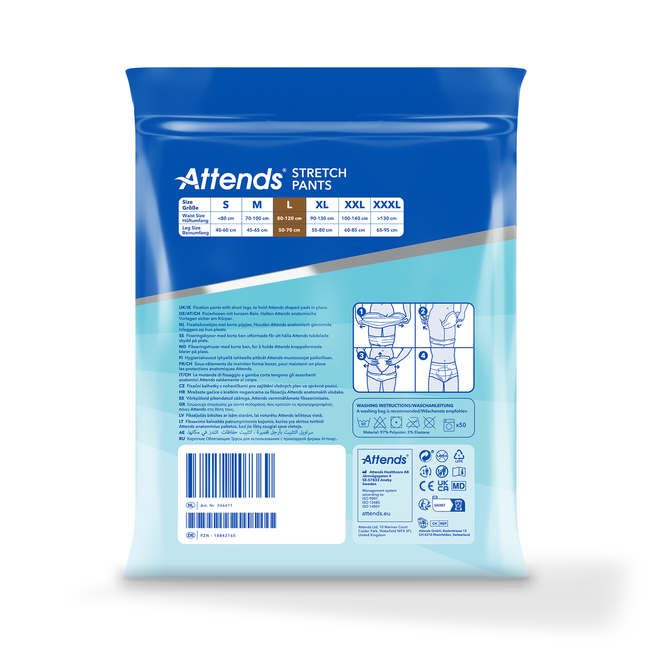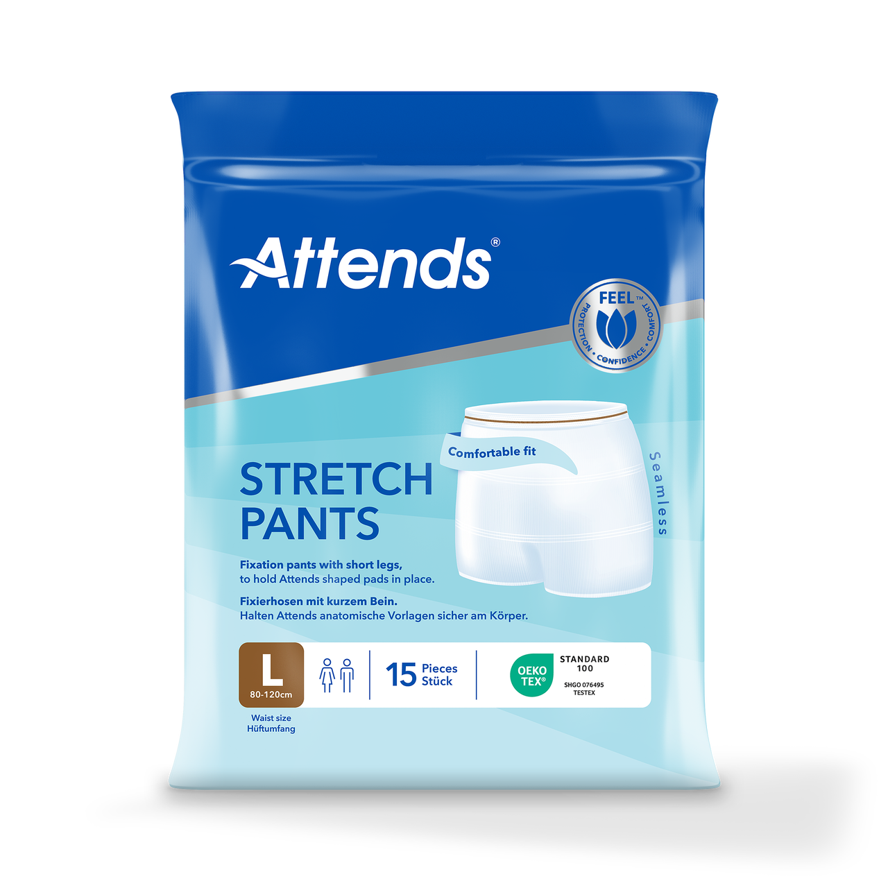 Attends Stretch Pants L är tvättbara och återanvändbara fixeringsbyxor med korta ben. Fixeringsbyxorna används tillsammans med tvådelade inkontinensskydd och säkerställer en tät fixering vilket minimerar risken för läckage. Attends Stretch Pants är gjorda av ett elastiskt material som ger bra komfort, passform och stöd. Den sömlösa designen minskar risken för märken på huden och ger en säker och diskret fixering. Mät höfter och midja och utgå från det största måttet för att välja rätt storlek på fixeringsbyxan.