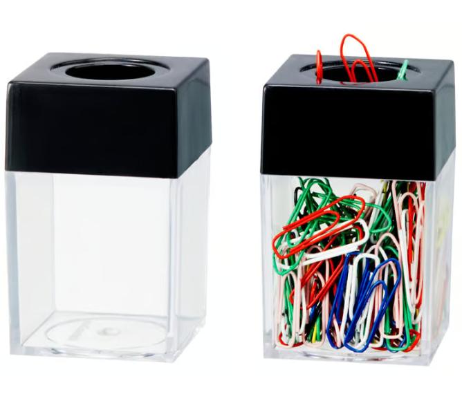 Fyrkantig, magnetisk gemkopp i plast. 7 cm hög. Svart/transparent.