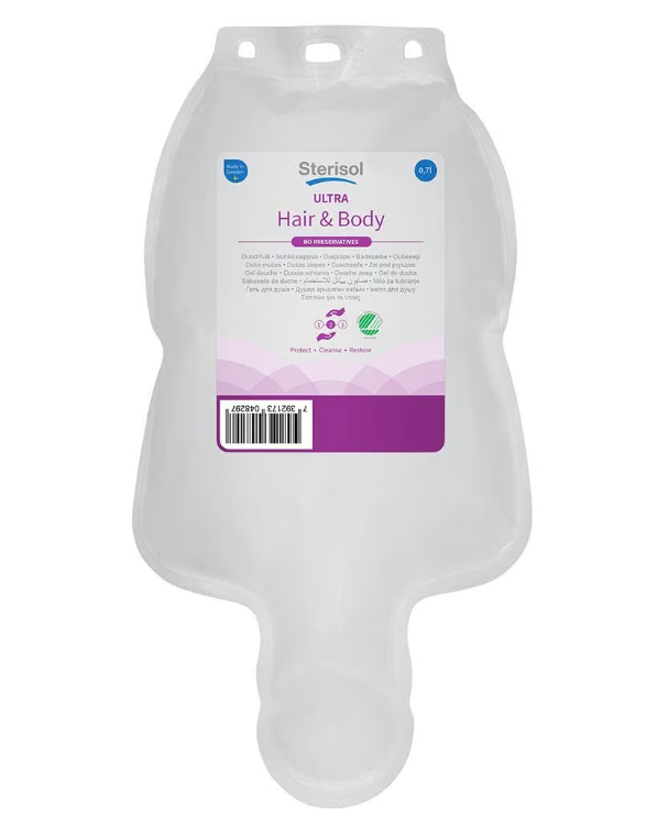 Sterisol Ultra Hair & Body 700ml med mild parfymering är lämplig i miljöer där frekvent dusch förekommer. Till exempel inom livsmedelsbranschen, tyngre industri, sjukvård, sim- och idrottshallar. Tack vare effektiviteten och skonsamheten ger den en hygienisk tvätt som är viktig i många verksamheter, samtidigt som den återfuktar hud och hår. Måste användas med dispenser, annars kan läckage uppstå.