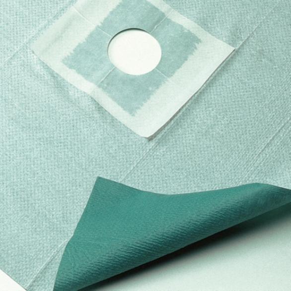 Foliodrape Protect häftande hållakan består av en ovansida av behaglig, mjuk non-woven och en undersida av polyetylenfolie som är ogenomtränglig för fukt och bakterier. Vidhäftning runt hålet som har en diamter på 7cm.