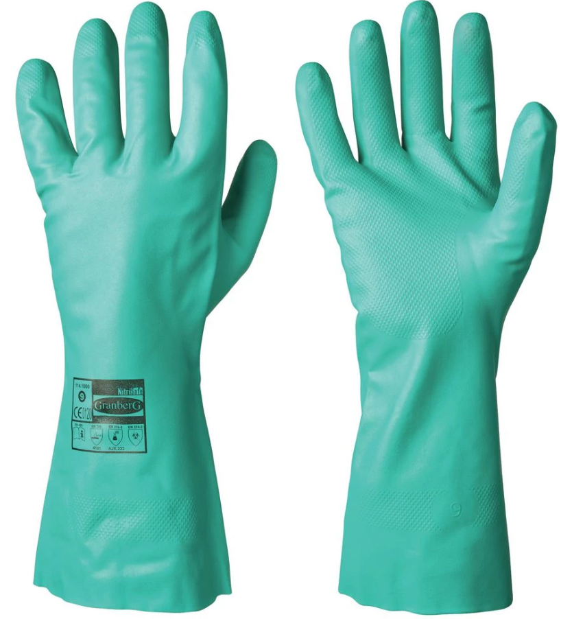 Handskarna är något längre än vanliga handskar vilket ger skydd även upp på handlederna. Idealiska för användning i torra eller våta förhållanden. Den flossade insidan gör dem extra bekväma och tack vare det räfflade mönstret på handflatan och fingrarna får handsken en halksäker yta. Nitrilgummit gör dem mycket motståndskraftiga mot kontakt med olja, fett och andra kemiska ämnen.