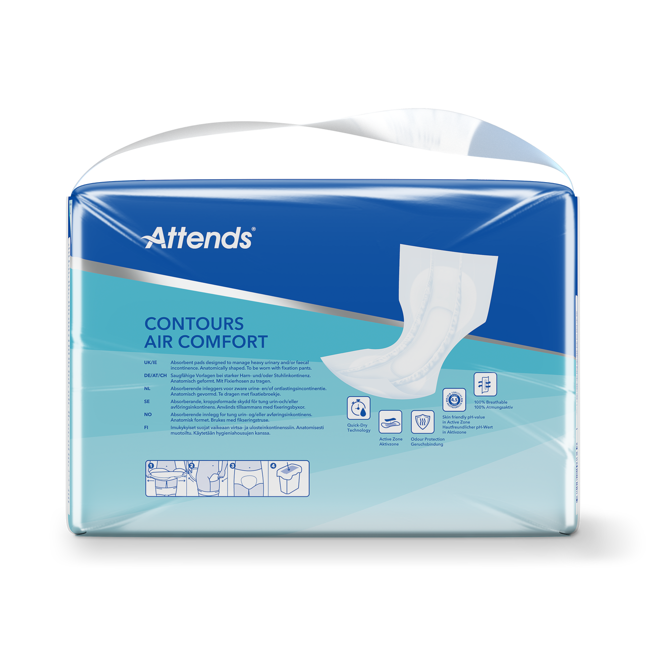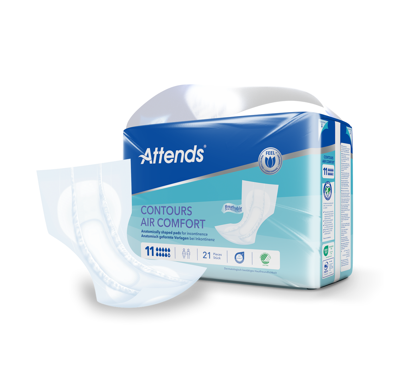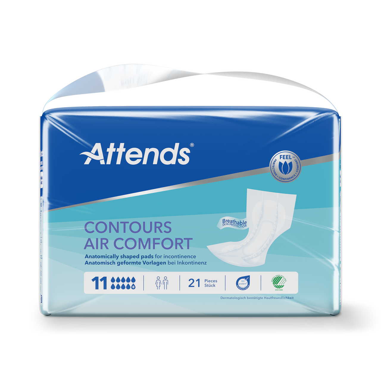 Attends Contours Air Comfort 11 ingår i en serie anatomiskt utformade skydd framtagna för att hantera tung urin -/avföringsinkontinens. Serien har andningsbar textilliknande utsida för god hudhälsa. Används tillsammans med Attends fixeringsbyxor för optimal passform. Skydden har en superabsorberande kärna för ökad läckagesäkerhet, torrhet och minskad otrevlig lukt. Våtindikatorn visar när skyddet rekommenderas att bytas. Passar bra till användare som önskar ett medelstort skydd dag som natt och som upplever större mängder läckage.