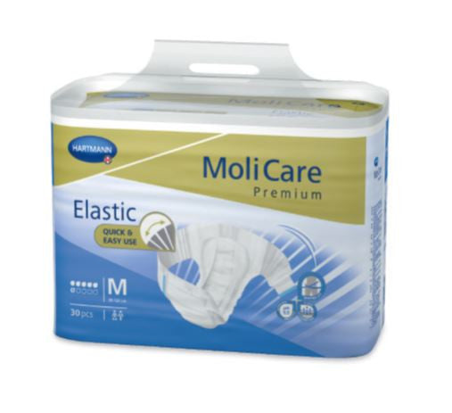MoliCare Premium Elastic är ett absorberande inkontinensskydd med fixering och skydd i ett. Tack vare dess högelastiska sidopaneler i mjukt material och breda kardborrefästen ger MoliCare Premium Elastic en snabb, enkel och säker fixering. Tre lagers absorptionsdyna med Dry Plus skikt Tre lagers absorptionsdyna ger skyddet extra stabilitet. Dry Plus skiktet leder vätskan snabbt in i absorptionskärnan och skyddar mot återvätning. Högelastiska sidopaneler Sidopaneler i mjukt, högelastiskt material möjliggör en mycket enkel och säker fixering. Passar alla kroppsformer och är bekväm att bära. Breda kardborrefästen Kombinerade tejp- och kardborrefästen fäster säkert på det textila ytskiktet. Dess bredd ger en enkel, snabb och säker fixering. Kardborrefästerna gör att skyddet kan fixeras många gånger om. Antiläckagesystem Formade mjuka vätskeavvisande läckagebarriärer ger extra skydd mot sidoläckage. HighDry SAP med Odour Neutralizer Superabsorbenterna absorberar och kapslar in vätskan snabbt och förhindrar oönskad lukt. Textilkomfort Det textilliknande ytskiktet är mjukt mot huden och ger en hög komfort. Diskret utsida Utsidan är diskret färgad med produktnamn och droppmarkeringar för att underlätta val av rätt produkt. Längsgående våtindikator Längsgående våtindikator på produktens utsida visar hur stor del av absorptionsdynan som utnyttjats.