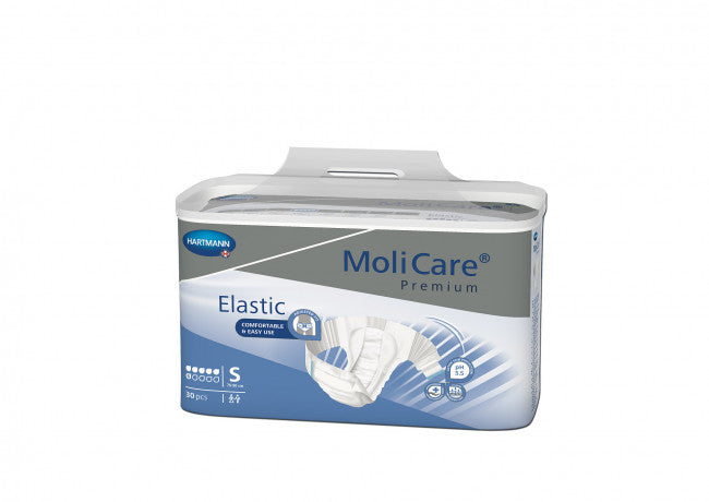 MoliCare Premium Elastic är ett absorberande inkontinensskydd med fixering och skydd i ett. Tack vare dess högelastiska sidopaneler i mjukt material och breda kardborrefästen ger MoliCare Premium Elastic en snabb, enkel och säker fixering. Tre lagers absorptionsdyna med Dry Plus skikt Tre lagers absorptionsdyna ger skyddet extra stabilitet. Dry Plus skiktet leder vätskan snabbt in i absorptionskärnan och skyddar mot återvätning. Högelastiska sidopaneler Sidopaneler i mjukt, högelastiskt material möjliggör en mycket enkel och säker fixering. Passar alla kroppsformer och är bekväm att bära. Breda kardborrefästen Kombinerade tejp- och kardborrefästen fäster säkert på det textila ytskiktet. Dess bredd ger en enkel, snabb och säker fixering. Kardborrefästerna gör att skyddet kan fixeras många gånger om. Antiläckagesystem Formade mjuka vätskeavvisande läckagebarriärer ger extra skydd mot sidoläckage. HighDry SAP med Odour Neutralizer Superabsorbenterna absorberar och kapslar in vätskan snabbt och förhindrar oönskad lukt. Textilkomfort Det textilliknande ytskiktet är mjukt mot huden och ger en hög komfort. Diskret utsida Utsidan är diskret färgad med produktnamn och droppmarkeringar för att underlätta val av rätt produkt. Längsgående våtindikator Längsgående våtindikator på produktens utsida visar hur stor del av absorptionsdynan som utnyttjats.