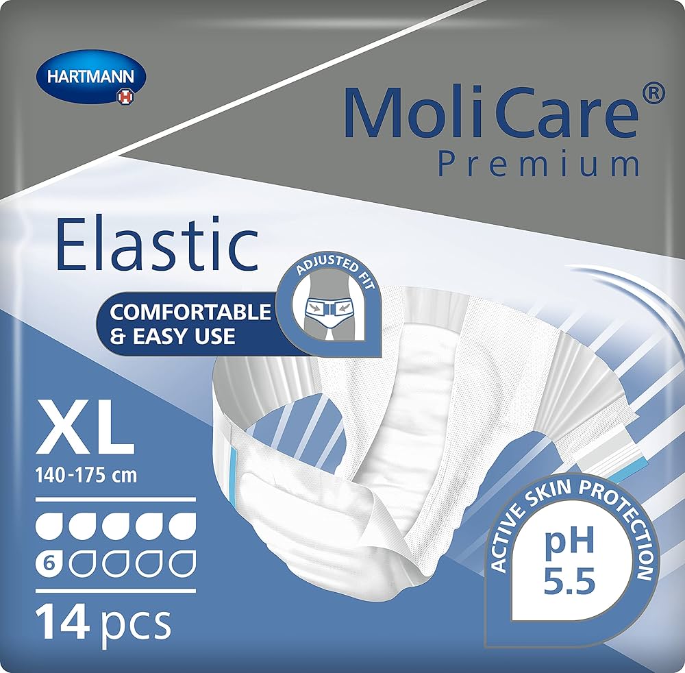 MoliCare Premium Elastic är ett absorberande inkontinensskydd med fixering och skydd i ett. Tack vare dess högelastiska sidopaneler i mjukt material och breda kardborrefästen ger MoliCare Premium Elastic en snabb, enkel och säker fixering. Tre lagers absorptionsdyna med Dry Plus skikt Tre lagers absorptionsdyna ger skyddet extra stabilitet. Dry Plus skiktet leder vätskan snabbt in i absorptionskärnan och skyddar mot återvätning. Högelastiska sidopaneler Sidopaneler i mjukt, högelastiskt material möjliggör en mycket enkel och säker fixering. Passar alla kroppsformer och är bekväm att bära. Breda kardborrefästen Kombinerade tejp- och kardborrefästen fäster säkert på det textila ytskiktet. Dess bredd ger en enkel, snabb och säker fixering. Kardborrefästerna gör att skyddet kan fixeras många gånger om. Antiläckagesystem Formade mjuka vätskeavvisande läckagebarriärer ger extra skydd mot sidoläckage. HighDry SAP med Odour Neutralizer Superabsorbenterna absorberar och kapslar in vätskan snabbt och förhindrar oönskad lukt. Textilkomfort Det textilliknande ytskiktet är mjukt mot huden och ger en hög komfort. Diskret utsida Utsidan är diskret färgad med produktnamn och droppmarkeringar för att underlätta val av rätt produkt. Längsgående våtindikator Längsgående våtindikator på produktens utsida visar hur stor del av absorptionsdynan som utnyttjats.