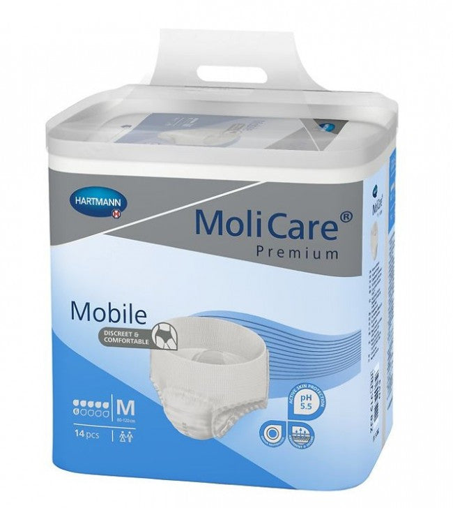 MoliCare Premium Mobile engångsbyxor ser ut som vanliga underkläder tack vare dess anatomiska form, mjuka material och höga elastik, vilket också ger en kroppsnära passform och hög diskretion. Ytskiktet av Curly fiber närmast huden ger en antibakteriell och pH 5,5-neutral effekt för optimal hudhälsa.MoliCare Premium Mobile är dermatologiskt testad. Den absorberande kärnan neutraliserar lukt, absorberar snabbt och håller huden torr. Byxan ger maximalt läckageskydd genom en tre-lagers absorptionskärna och ett tvådelat sidobarriärsystem som ger säkert skydd mot sidoläckage.Rivbara sidosömmar gör skyddet enkelt att ta av. Färgens tråd i midjan indikerar storlek och absorptionskapacitet.Användning Lämplig vid urin- och avföringsinkontinens, framför allt för rörliga patienter. Den enkla användningen gör den särskilt lämplig vid toaletträning.