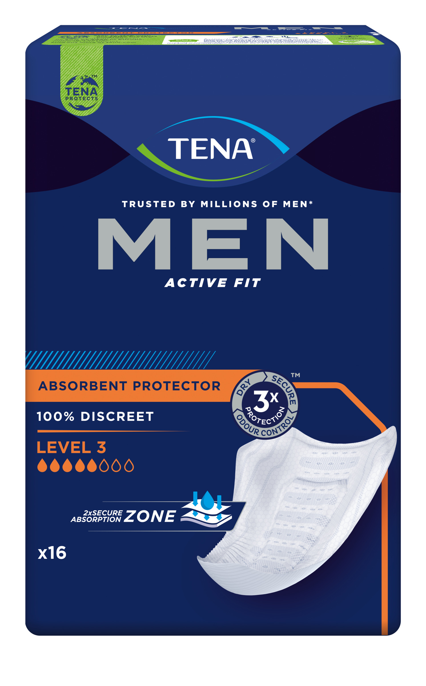 TENA Men Level 3 är vårt mest absorberande och effektiva skydd mot stora urinläckage. Skydden erbjuder trippelt skydd mot stora urinläckage, lukt och fukt, tack vare de dubbla kärnorna och det snabbabsorberande lagret. Skydden är endast 10 mm tjocka med en mjuk skålform som anpassar sig efter din kropp, och är därmed både diskreta och bekväma. Ta bort förpackningen och fäst skyddet i kalsongerna med hjälp av den självhäftande tejpen. De håller dig fräsch och du märker knappt att de är där, vilket gör att du kan fokusera på dagen framför dig.