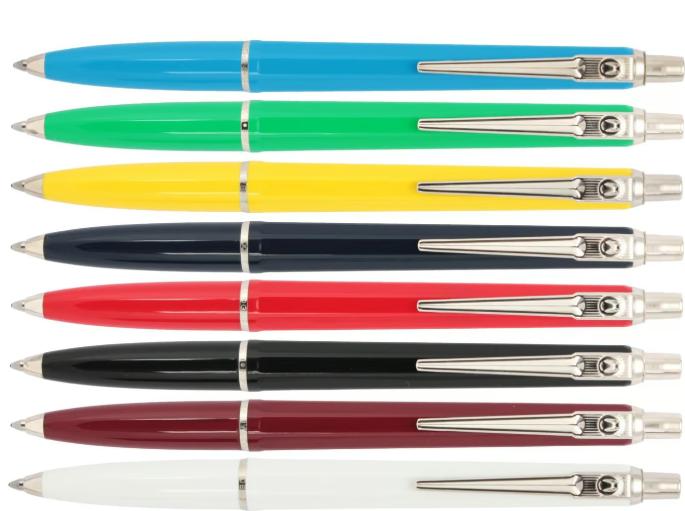 Kulspetspenna i cellulosaplast. Förnicklad tryckknapp, ring, clips och spetsförstärkning. Blått bläck, certifierat Svenskt Arkiv. Skrivlängd c:a 8.000 meter. Blank plast. Reservpatroner finns.
