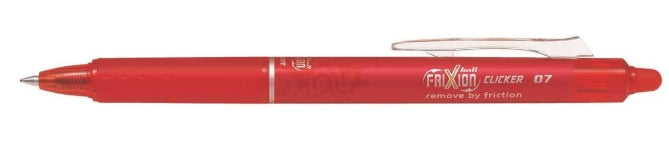 Frixion Clicker är en kulspetspenna som man kan sudda med. Pennan har klickmekanism istället för en huv. Den skrivna texten kan suddas så många gånger man vill. Röd.