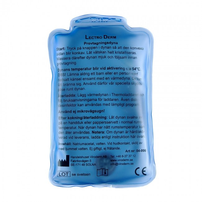 En liten smidig värmedyna på 9x13cm som aktiveras genom att man trycker på aktiveringsknappen inne i dynan som sedan alstrar upp till c:a 54 graders värme. Dynan underlättar provtagningen och har också en lugnande effekt på stickrädda patienter. Kan återladdas mer än etthundra gånger. Vi rekommenderar att man också använder artikel 434025 (skyddspåse) vid användandet då den säkrar att inte dynan uppfattas för varm av småbarn och andra personer som inte själva kan avgöra hur de reagerar på värmen från dynan. Innehållsdeklaration:Natriumacetat, vatten. Vid hudkontakt:Skölj av med ljummet vatten. Ej giftigt, ej frätande.