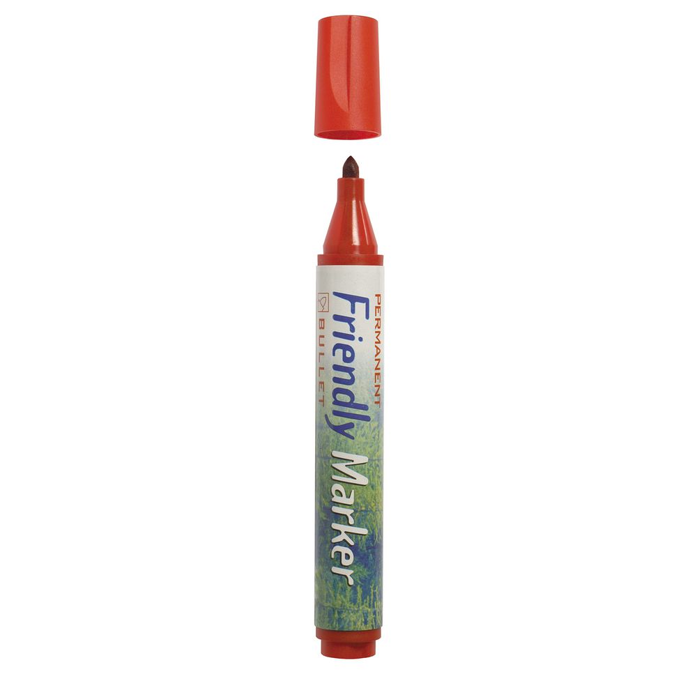 Märkpenna Friendly rund röd. Alkoholbaserad permanent märkpenna. Fäster på de flesta underlag. Pennkroppen är tillverkad av återvunnet papper vilket minskar miljöpåverkan med 50 %. Rund spets, röd. Pennkroppen är tillverkad av 80% återvunnet material Permanent bläck Med huv Rund spets Linjebredd: 1,5-3mm Textfärg: Röd