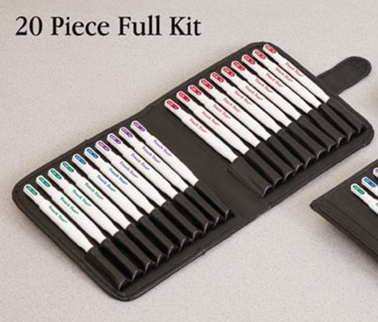 Använd för att testa sensoriska nivåer och få objektiv data för korrekt rapportering om statusen för minskande eller återkommande känslighet. Filamentet böjer sig när toppkraftsgränsen uppnås. Det unika handtaget öppnas enkelt till 90 º vinkel för provning. När den är stängd kan Sensory Evaluator transporteras säkert i en ficka eller bärväska, skydda glödtråden när den inte används. Fingertryck på handtaget ger en fast och bekväm hållning. Sensory Evaluator handtag är märkta med motsvarande färgkodade trycknivå. Individuell ersättning Sensoriska utvärderare säljs separat, inklusive 5,07, vilket indikerar förlust av skyddande känsla till fots. Finns i en 5-bitars handkit, en 6-bitars fodsats och en 20-bitars komplett kit. Varje kit kommer i ett skyddshölje. Instruktioner ingår. Använd färgpennsatsen till färgkodstestade områden och visuellt återbilda nervskador för patienter. Innehåller en penna varje grön, blå, lila, röd och svart. Utvärderingsresultat kan registreras på handskärmsformulär eller fotformulär. Dessa bärbara sensoriska utvärderare tillverkas inom en 5% standardavvikelse för varje målstyrka.