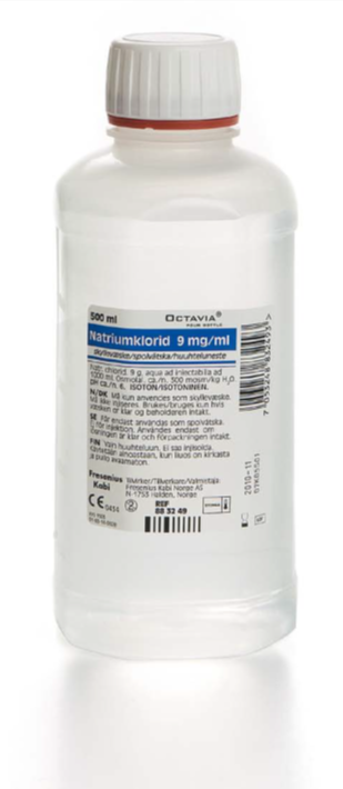 Tydlig volymskala Förseglingsring som bryts när flaskan öppnas Klar och genomskinlig plast Kan förvaras i värmeskåp vid 40ºC i 6 månader Åttkantig plastflaska som ger ett säkert grepp Jämn stråle utan stänk Användningsområden Spolning av kompresser, instrument och sår Hållbarhet Från tillverkningsdatum: 3 år När förpackningen har brutits: 24 timmar Förvaras vid rumstemperatur När produkten förvarats i värmeskåp ska den destrueras Natriumklorid 9 mg/ml Sterilt vatten