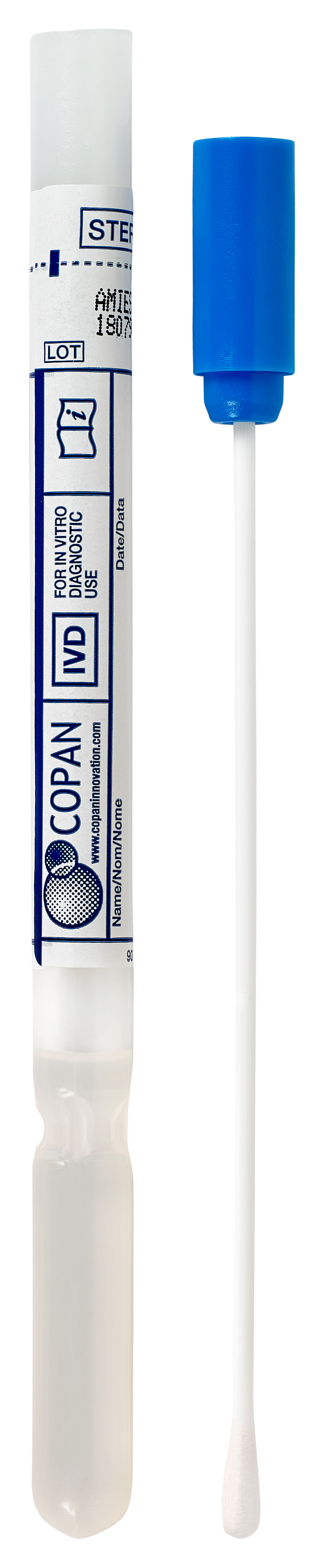 Transportrör med Amies medium utan KolBipackad provtagningspinne i plast med rayontipBlå korkREF: 108C.USE