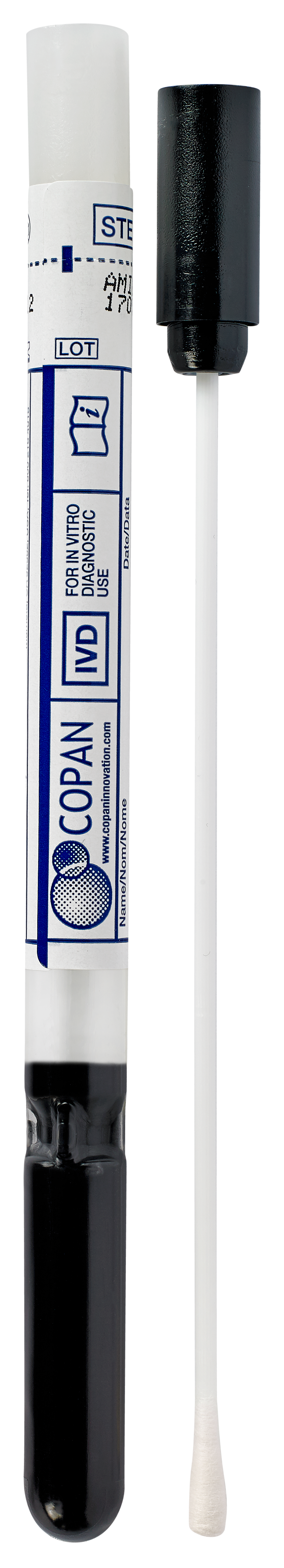 Transportrör med Amies kolade mediumBipackad provtagningspinne i plast med rayontipSvart kork För sårodling mm.REF: 114C.USE