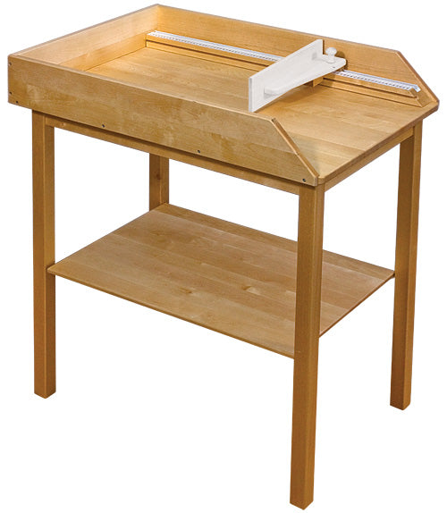 Skötbord i trä med inbyggd mätfunktion i vit mm-skala med svart text. Mätsläde med inbyggd glidstopp.