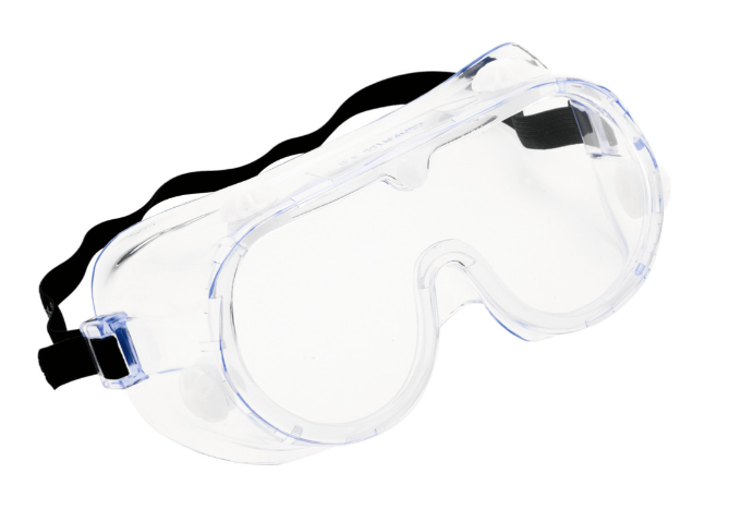 Korgglasögon med korg av mjukplast med 4 ventiler, imfri lins i polykarbonat och nackband av resår.