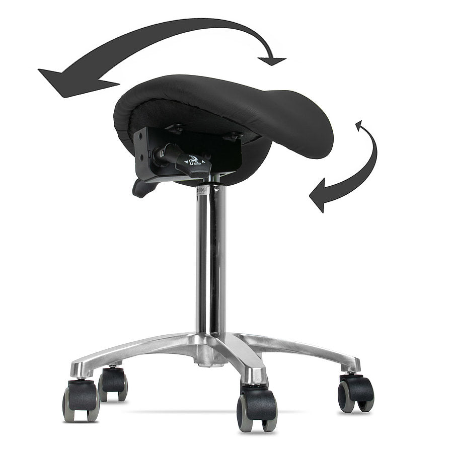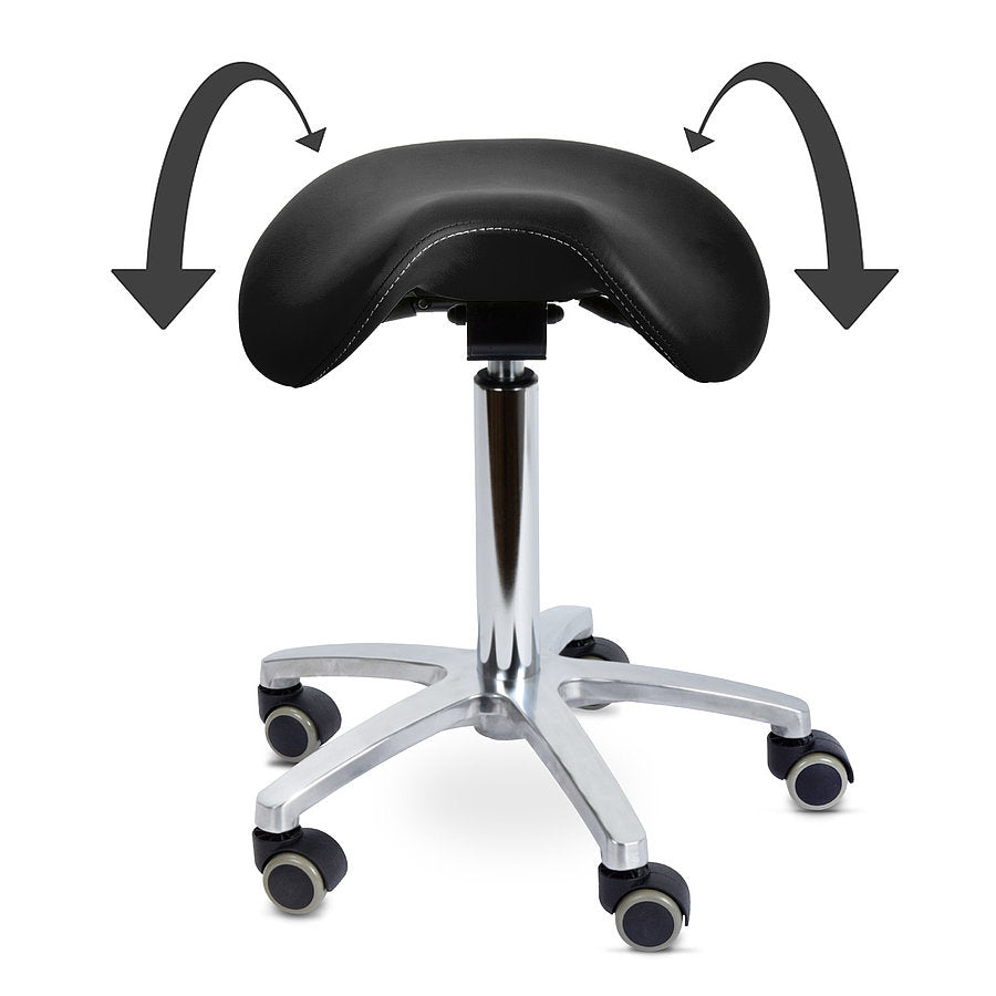 Snurrpallen med lutningsbar sadelstol har en ergonomiskt formad sits som kan justeras i vinkel med hjälp av en lutningsmekanism. Pallen är justerbar i höjd mellan 53 cm och 73 cm.