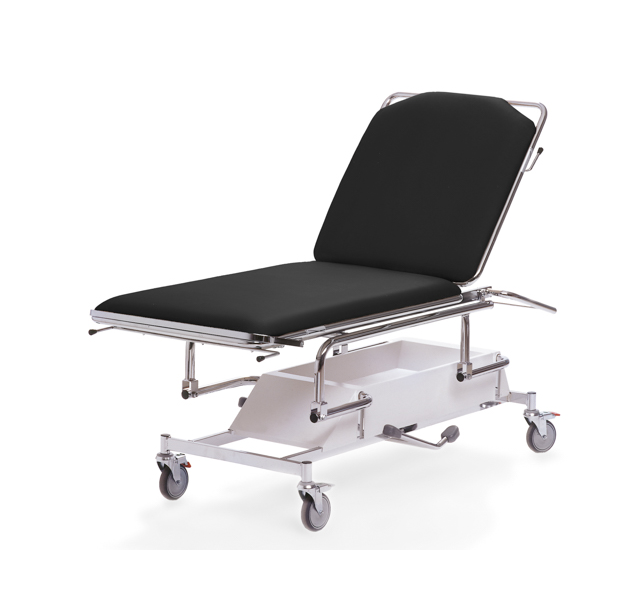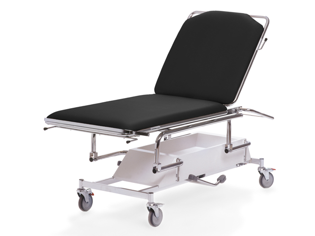 Hydraulisk undersökningsbrits med chockläge och hjul varav två låsbara, ett riktningsspärrat och ett fritt. Standard längd och bredd, 200x70 cm, höjd 53-91 cm. Konstläderklädda dynor.