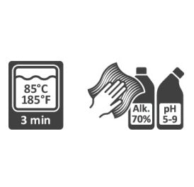 Rengör produkten med rengöringsmedel utan lösningsmedel och med pH-värde 5-9 eller med 70% desinfektionssprit. Kan vid behov dekontamineras i max 85°C.