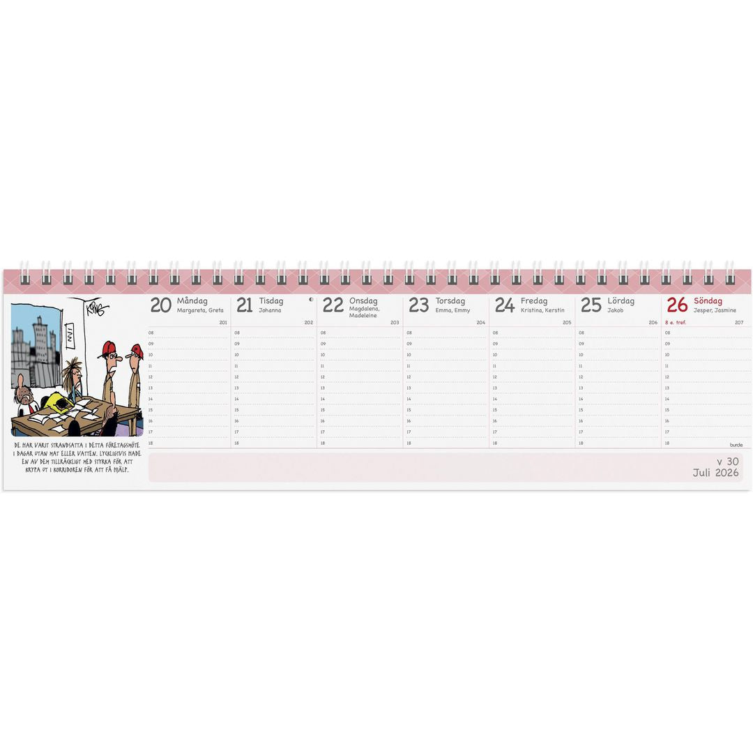 Almanacka Burde 1484 Veckoalmanackan Humor 2026. Kalender 2026 från Burde. Format: 305x90 mm. Layout: Stående. Vecka/uppslag. Timindelning 8-18. Kalendarium: 2025-12-22 - 2027-01-03. Omslag: Kartong. Spiralbunden. Innehåll: Årsöversikter. Antal sidor: 56. Miljöinformation: FSC®.