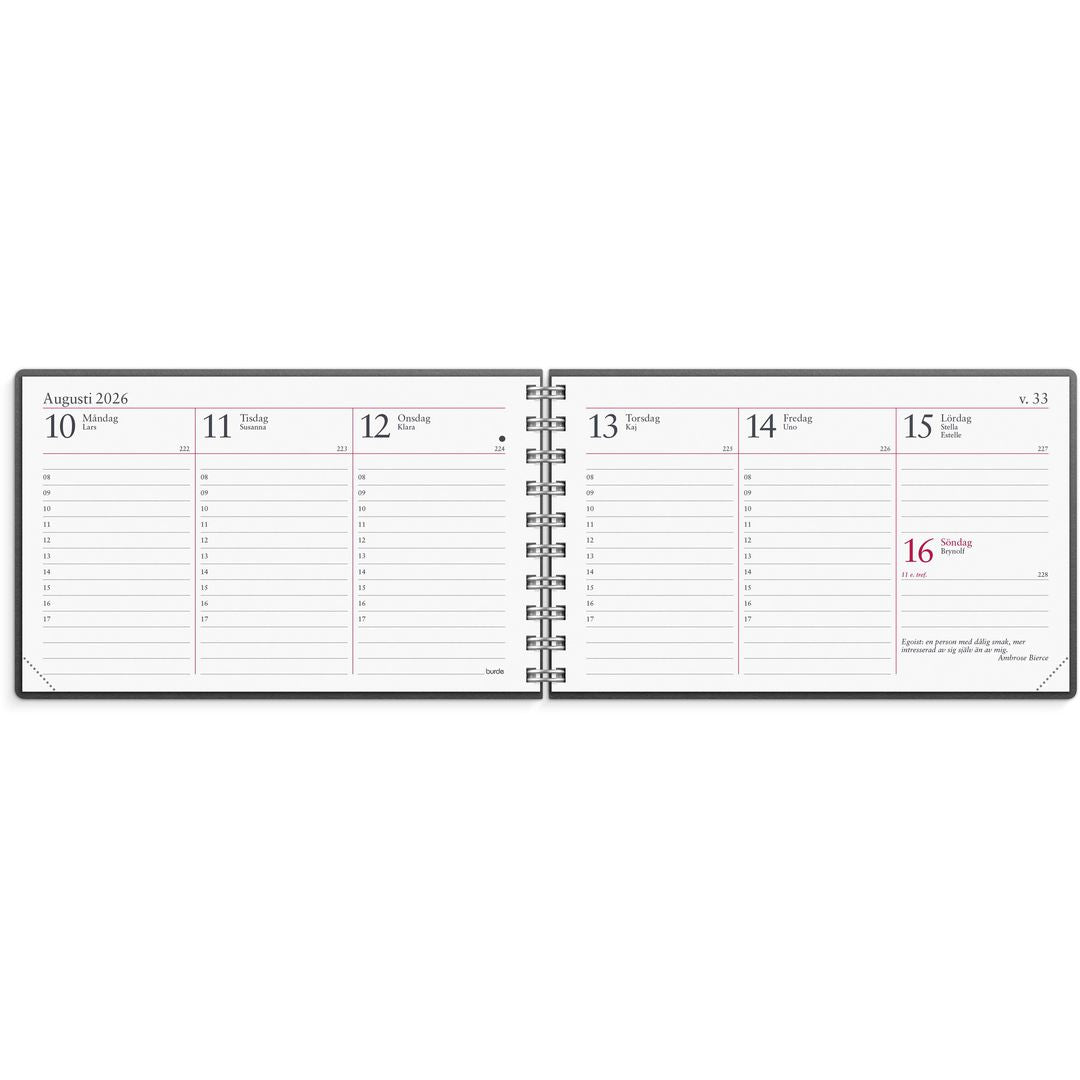 En vecka per uppslag. Timindelad 8-17. Kalendern kan användas som kombinerad fick- och bordskalender. Med telefonregister. Format: 300x90 mm (uppslagen).